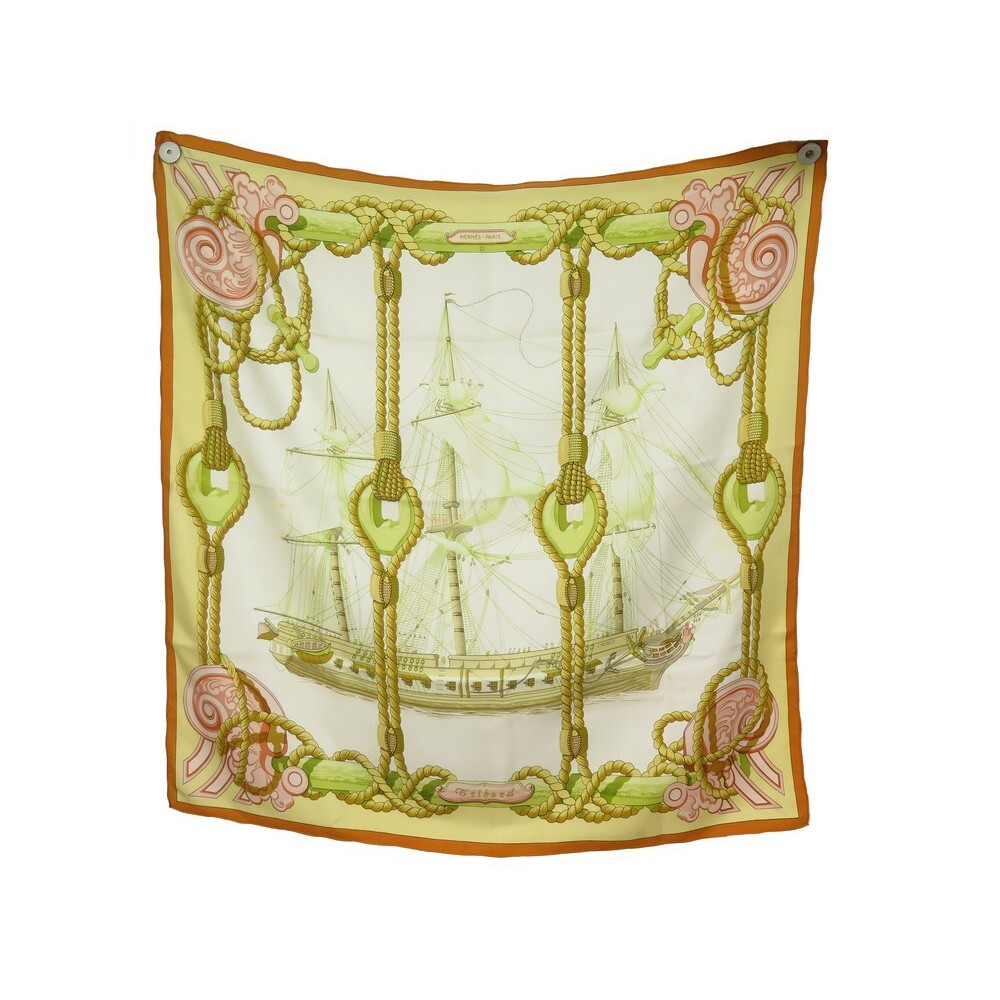 • RARE FOULARD HERMES LES TRIPLES NICOLE LAMBERT CARRE 90 CM EN SOIE JAUNE SCARF